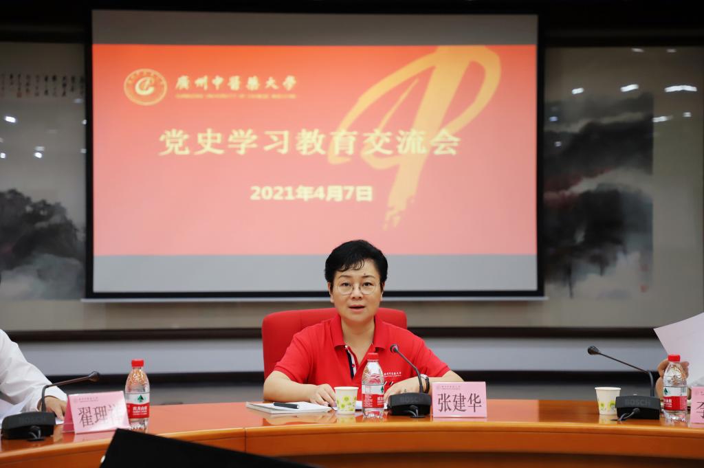 张建华以“四个结合”对当前学习教育工作提出具体要求。一要把党史学习和习近平总书记对广东的重要讲话和指示批示精神结合起来。要站在讲政治、讲大局的高度,谋划中医药事业在粤港澳大湾区建设中的重要地位,传承精华、守正创新,讲好中医药故事,推进中医药产学研一体化,推进中医药走向世界。二要把党史学习同学校“双一流”和高水平大学、高水平医院建设结合起来。要把思想和行动统一到党中央的决策部署和省委“1+1+9”工作部署上来,正确处理好改革发展稳定的关系,立足本职岗位,推动学科建设、人才培养、师资队伍高质量发展,不断提升学校治理能力和水平。三要把党史学习与解决师生反映的突出问题结合起来。深入开展“我为群众办实事”主题实践活动,以“小切口”解决大问题,解决师生员工最急切最迫切最盼望的问题,多谋民生之利,多解群众之忧。四要把党史学习与庆祝建党100周年结合起来。今年是中国共产党成立100周年,也是学校本科教育65周年。各部门要高度重视、认真履职,谋划好庆祝建党百年系列活动和学校本科教育65周年庆祝活动,本着勤俭、节约、有效的要求,为庆祝活动营造良好的校园文化氛围。