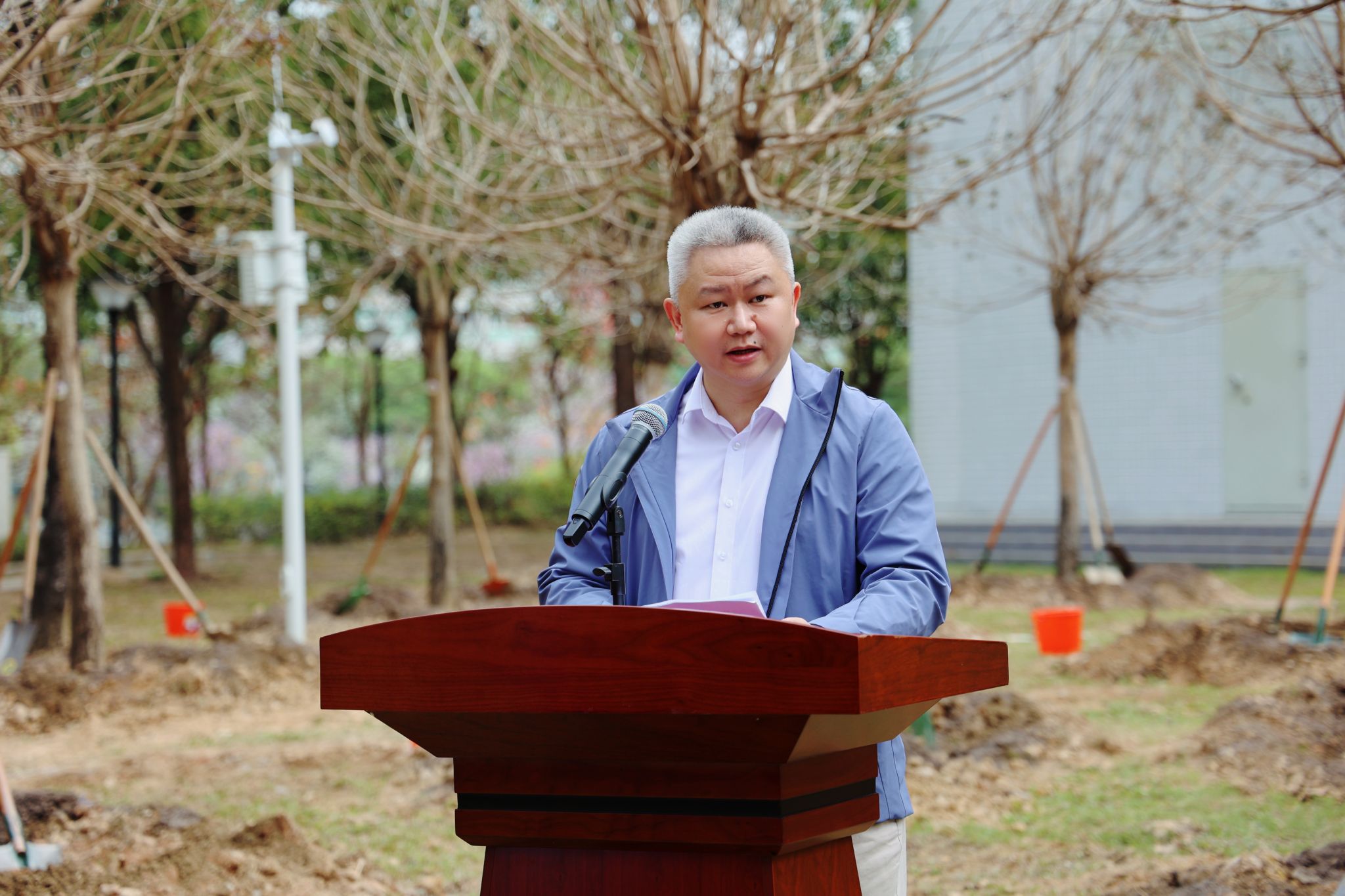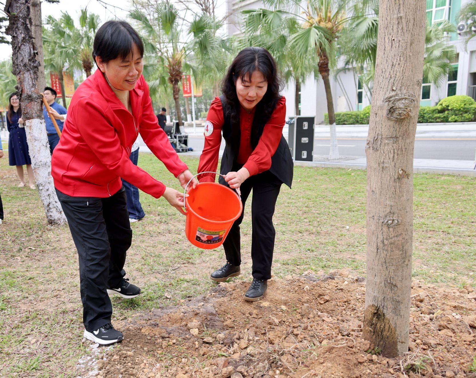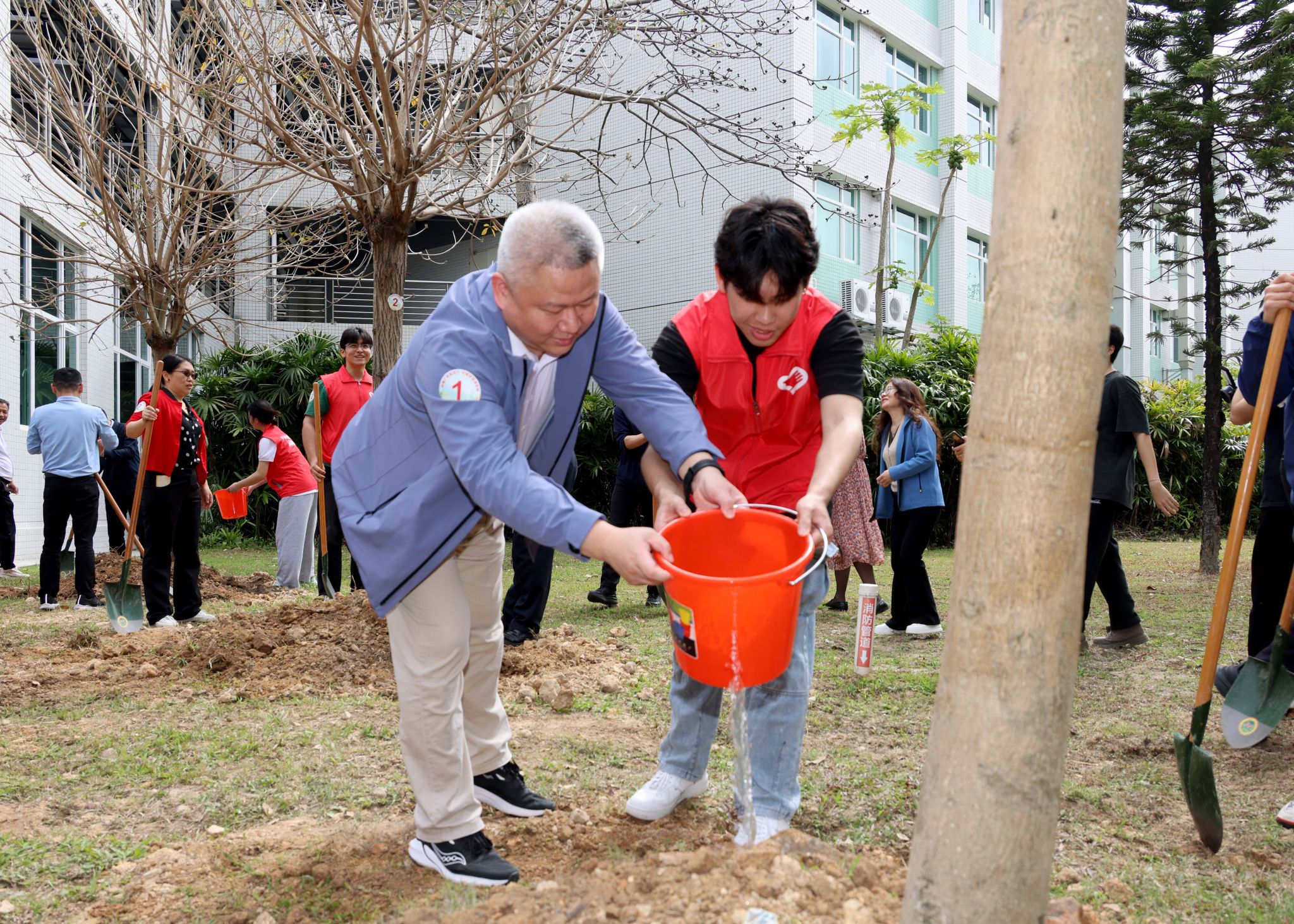 学校党委副书记邱亚洪,党委常委、纪委书记林奕娇,党委常委史亚飞,省纵向组团帮扶佛冈县工作队队长、佛冈县委副书记刘政,佛冈县政府党组成员、副县长叶荣盛,学校“双百行动”驻县服务队队员、校本部相关单位负责人、教师代表、学生代表、学生志愿者等,在大学城校区榕园旁共同种下15株紫花风铃木。党委常委、副校长郭鸿主持活动。