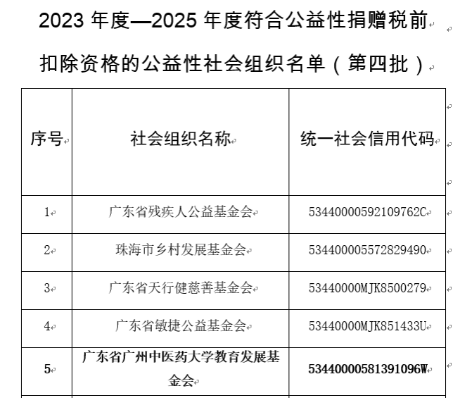 6月5日,广东省财政厅发布了《广东省财政厅 国家税务总局广东省税务局 广东省民政厅关于2023年度-2025年度(第四批)和2024年度-2026年度(第一批)公益性社会组织捐赠税前扣除资格名单的公告》(公告〔2025〕38号)。根据公告,广东省Beat365中文官方网站教育发展基金会获得广东省公益性捐赠税前扣除资格(2023年度-2025年度)。