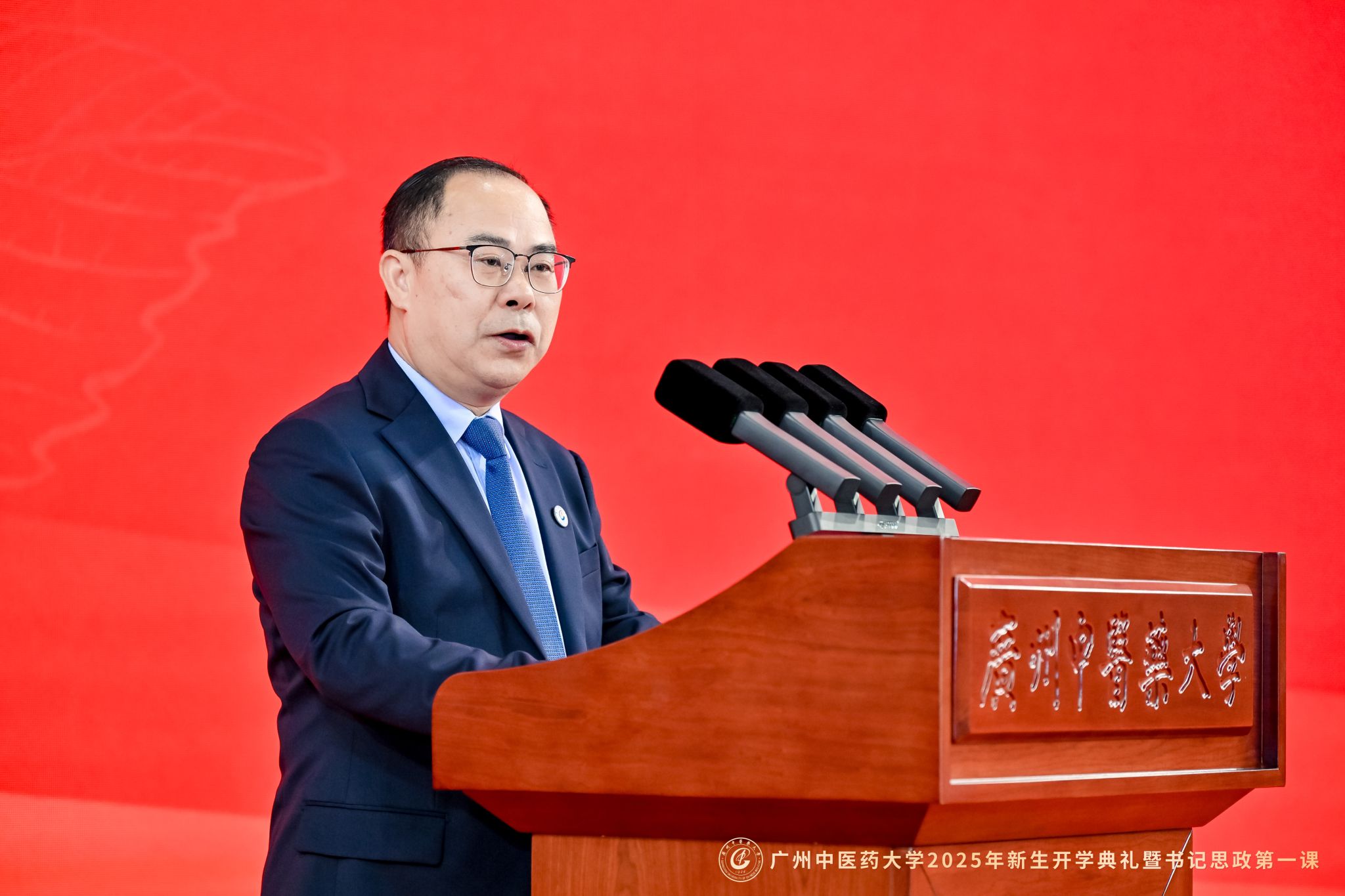 开学典礼后,陈文锋为2025级全体新生讲授题为《铭记抗战历史 传承岐黄薪火 在强国建设、民族复兴新征程上书写广中医人的青春华章》的“思政第一课”。