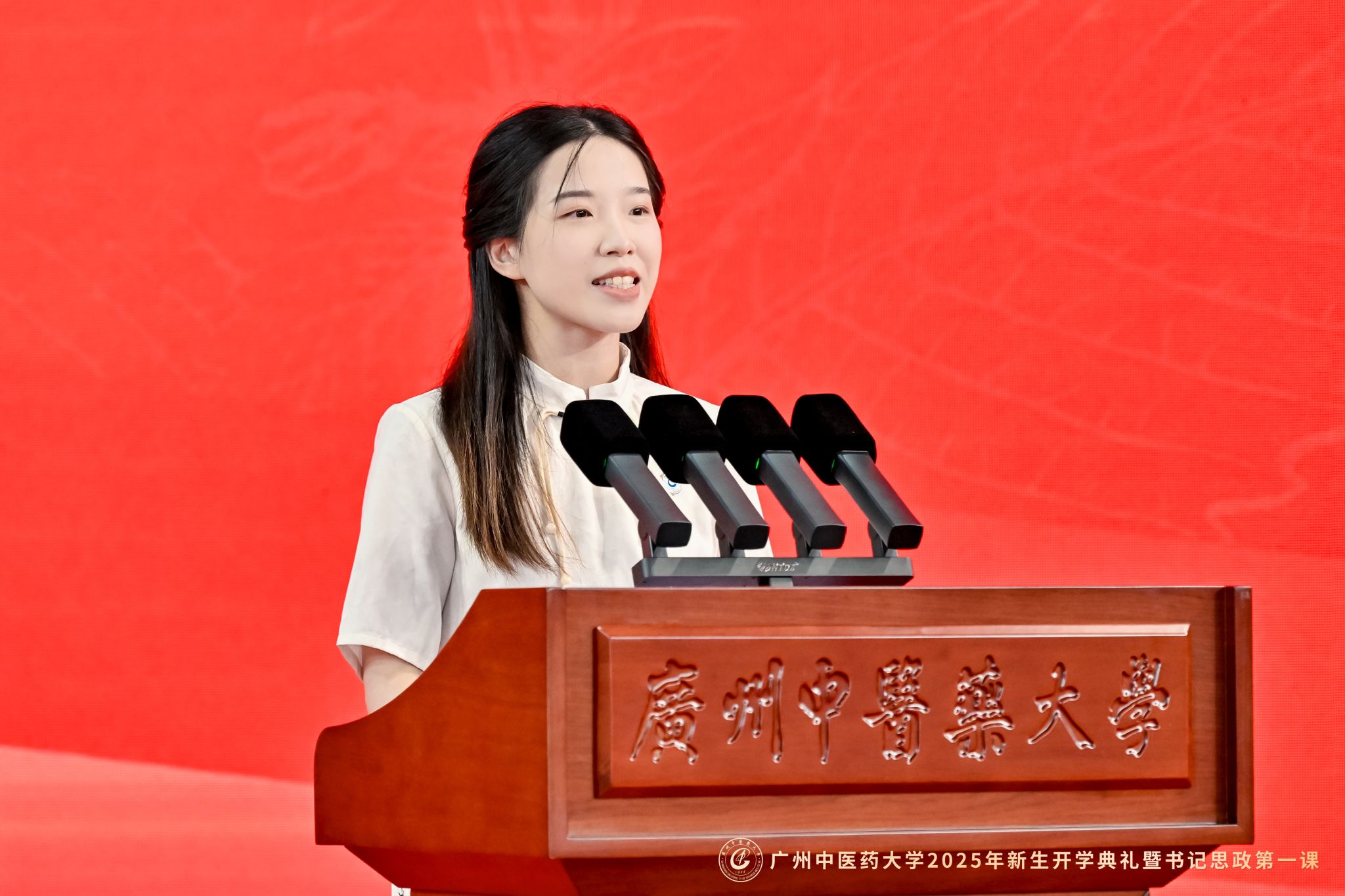 在校生代表2020级学生陈嘉慧同学以“我们是谁”“我们从哪里来”“我们要往哪里去”三问,与新生共勉,作为从百年薪火中走来的广中医人,秉承“厚德博学、精诚济世”校训的岐黄传人,要潜心经典,也要勇于实践,朝着守正创新、走向国际的目标前进,共同书写无悔的青春华章!