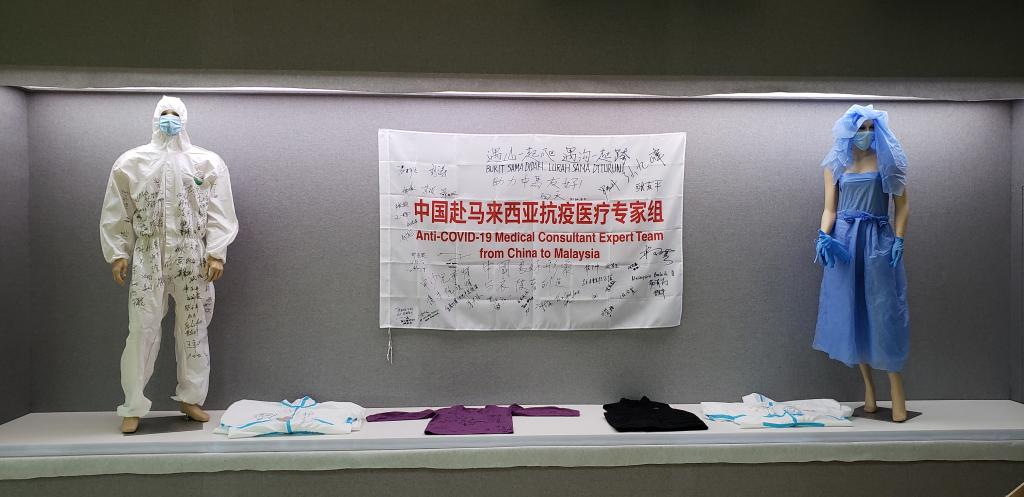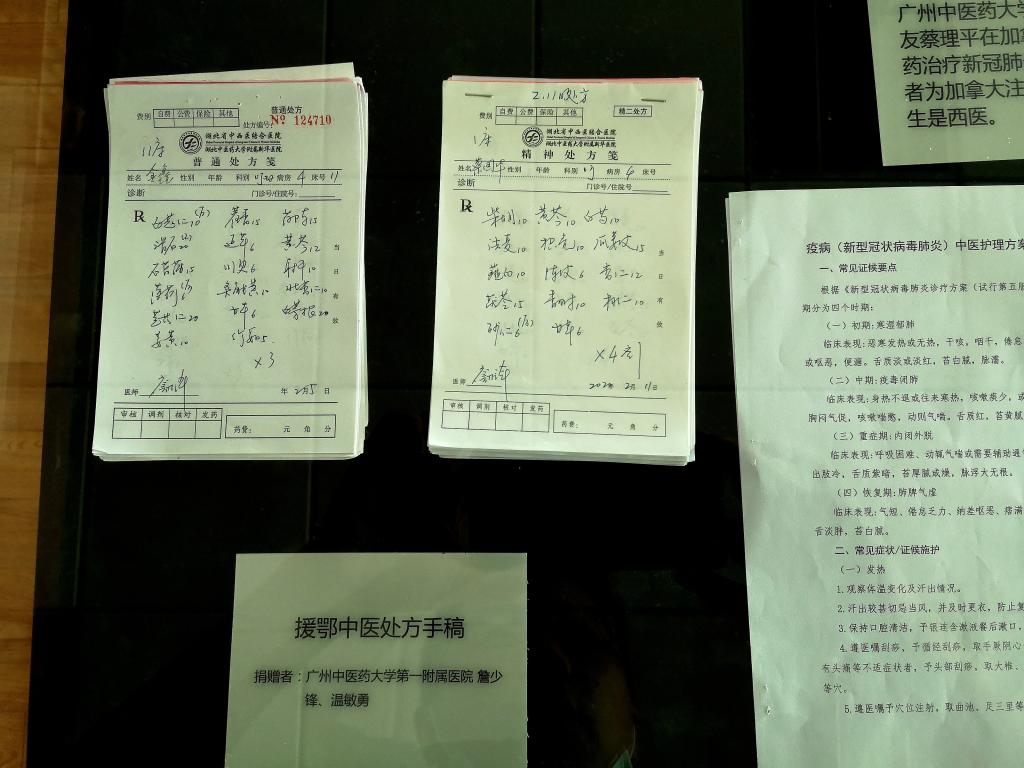 实物中展出了一套特别的“战地婚纱”。在疫情之初,学校第一附属医院护士唐杏杏主动推迟婚礼、请缨援鄂,医疗队队员用隔离衣为她改制婚纱,举行线上“婚礼”,这套珍贵的婚纱曾被广东省博物馆借展。馆内展品还包括前外交部长李肇星及夫人、中国前驻外大使、医药卫生专家等人签名的《给抗疫一线中医药战士们的一封家书》,援鄂医生入党宣誓词手稿、张忠德等国家中医医疗队(广东队)队员签名的防护服、中国赴马来西亚抗疫医疗专家组成员签名的旗帜,还有附属医院援鄂医疗队队员的大量中医处方手稿、中医护理方案、护理记录等。