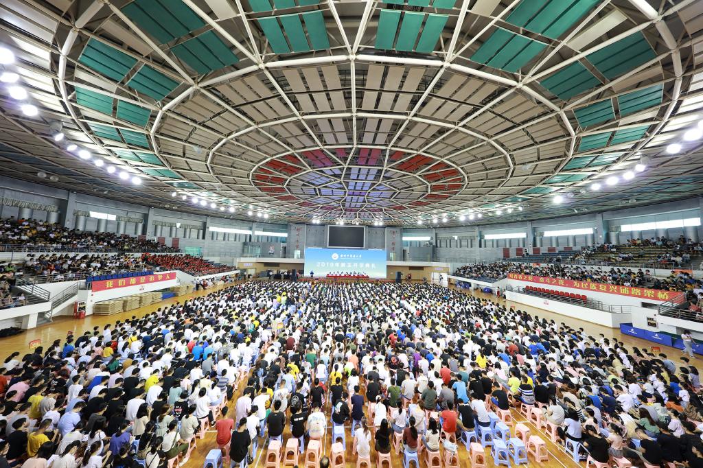 9月3日上午,2019级新生开学典礼在大学城校区隆重举行。全体普通本科新生、少数民族预科生,研究生院和国际学院新生代表共3000余人齐聚大学城校区体育馆,开启大学生活新征程。学校领导张建华、王省良、许能贵、林彬,国医大师周岱翰教授及有关管理部门和各学院负责人出席。学校党委副书记邓国安主持典礼。