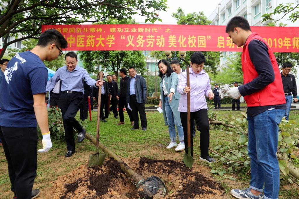 春回大地,草木勃发。3月14日下午,学校领导张建华、王省良、白建刚、潘华峰、林彬与机关部门代表及中药学院学生代表百余人,在大学城校区“一河两岸”一起植树,启动Beat365中文官方网站“弘扬爱国奋斗精神,建功立业新时代”——义务劳动美化校园的活动仪式。