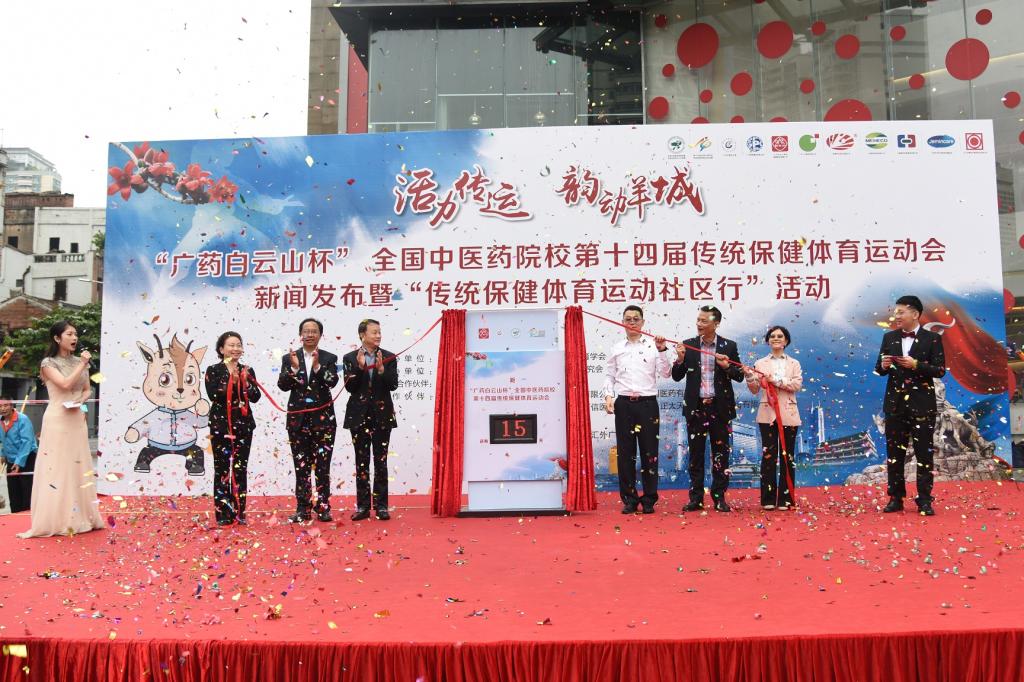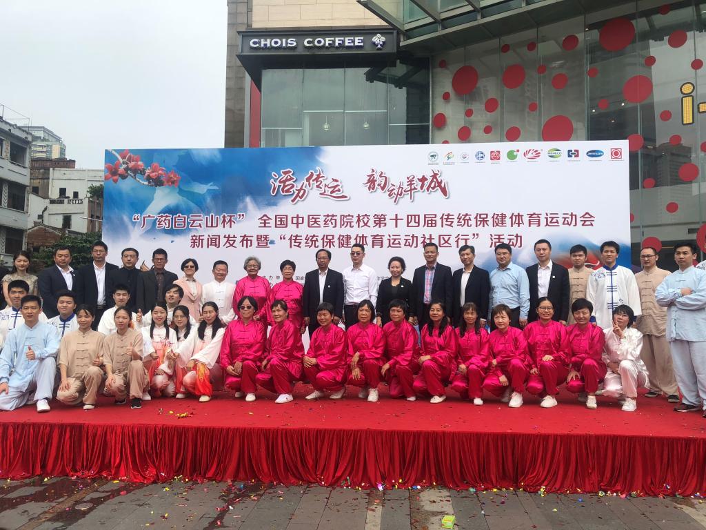 11月4日上午,“广药白云山杯”全国中医药院校第十四届传统保健体育运动会新闻发布暨“传统保健体育运动社区行”活动在广州市北京路粤海仰忠汇广场顺利举行。学校校长王省良、党委副书记翟理祥、副校长林彬,广州医药集团有限公司副总经理倪依东、广州医药有限公司副总裁梁智宇、广州白云山陈李济药厂有限公司党委副书记陈进伟、广州王老吉药业股份有限公司总工程师黄晓丹等出席活动。