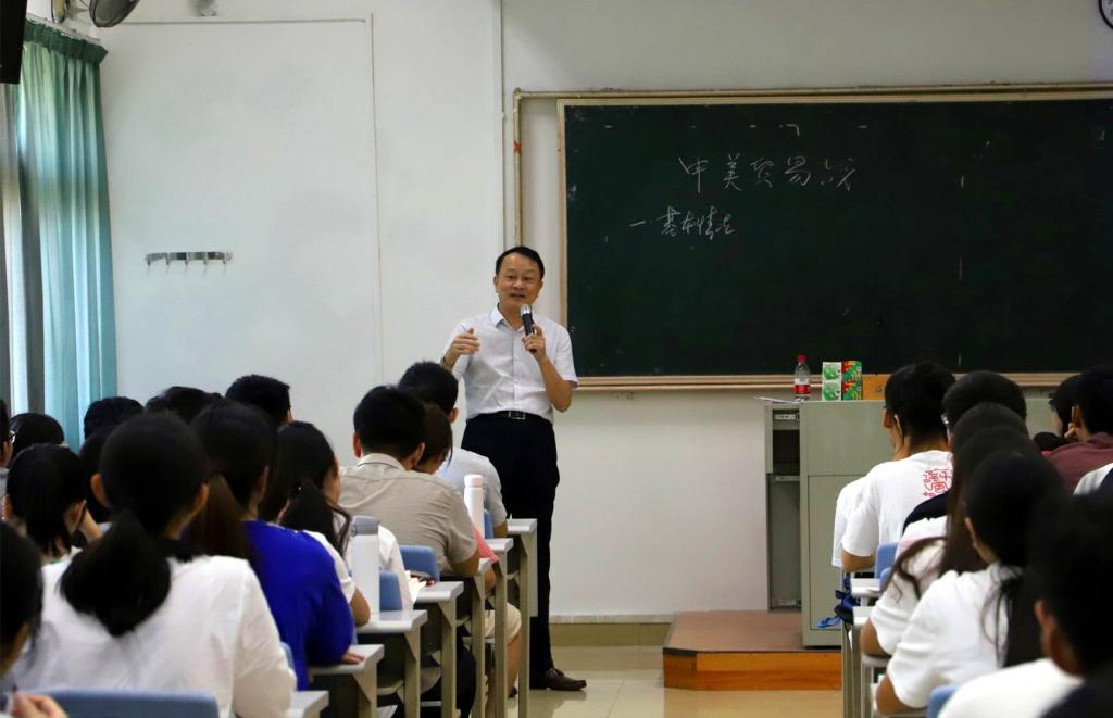 “有贸易就有争端”,王校长以近来美国挑起的中美贸易摩擦为主线,分析了当前国际形势,着重概述了中美贸易战的基本情况,剖析了中美贸易战的实质和对我国经济、科技等方面产生的影响,以及对全球政治经济带来的冲击。他列数了美国历年来在国际间挑起的矛盾和发动的战争,揭露其霸权主义的本质。他用数据分析论证中美贸易战对我国带来的影响是有限的,认为尚处于我们能承受和控制的范围,尤其在中国共产党的领导下,我们有反击并且打赢贸易战的底气和信心。