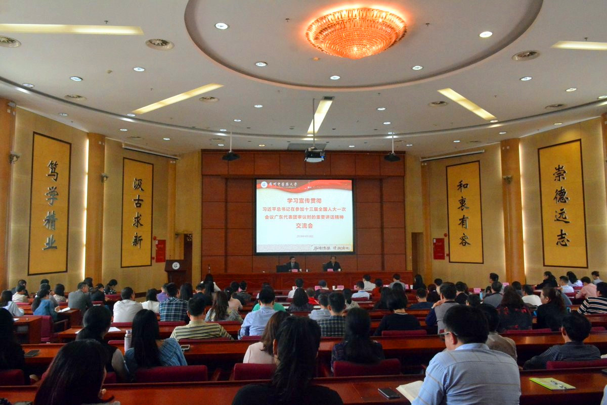 4月18日上午,我校在大学城校区办公楼学术报告厅举行了学习宣传贯彻习近平总书记参加十三届全国人大一次会议广东代表团审议时的重要讲话精神交流会,特邀全国人大代表、广州迈普再生医学科技有限公司董事长袁玉宇博士作为嘉宾作了中心发言。党委副书记翟理祥主持会议,学校党政干部、科技人员代表、团学干部代表200多人参会。
