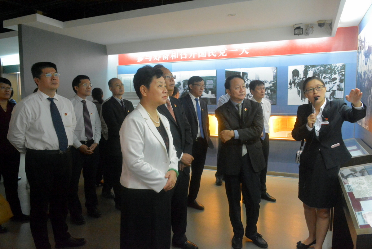 由遗址广场、春园(中共中央机关旧址)、历史陈列馆和旧民居5号楼组成的会址纪念馆,绿树掩映,繁花簇拥,闹中取静,倍显庄严肃穆。怀着对革命先辈的崇敬之情,中心组成员走进纪念馆,参观历史陈列,听取了中共三大召开历史背景、大会议题、历史作用和深远影响的讲解。中共三大决议和宣言、三大代表的委任状、代表们用过的钢笔和手表……一件件满载着革命历史的珍贵文物,一张张烙印着革命斗志的珍贵照片,一幕幕展现着革命激情的珍贵影像,张建华一行逐一观看,时而询问,重温党的峥嵘岁月。