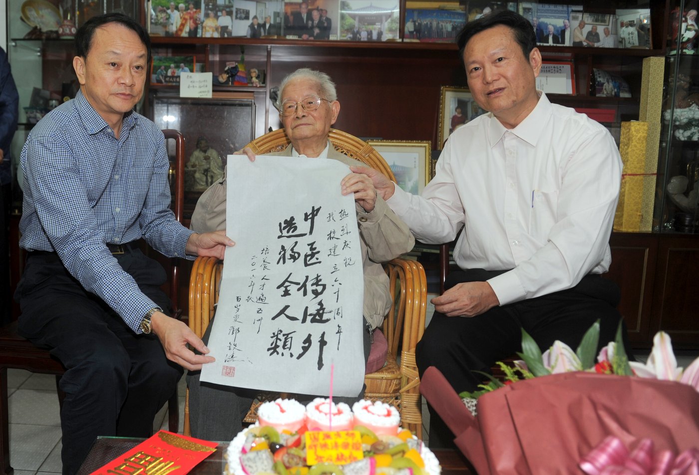 期颐之年的邓老精神矍铄,对学校领导的关心和慰问表示感谢,对学校改革发展取得的积极进展表示赞赏。他深情回忆了学校六十年的发展轨迹,表达了对学校加快推进高水平大学建设、继续引领中医药高等教育发展的殷殷期盼。邓老还向学校领导展示了他专门为纪念学校建校六十周年的题词“中医传海外,造福全人类”。