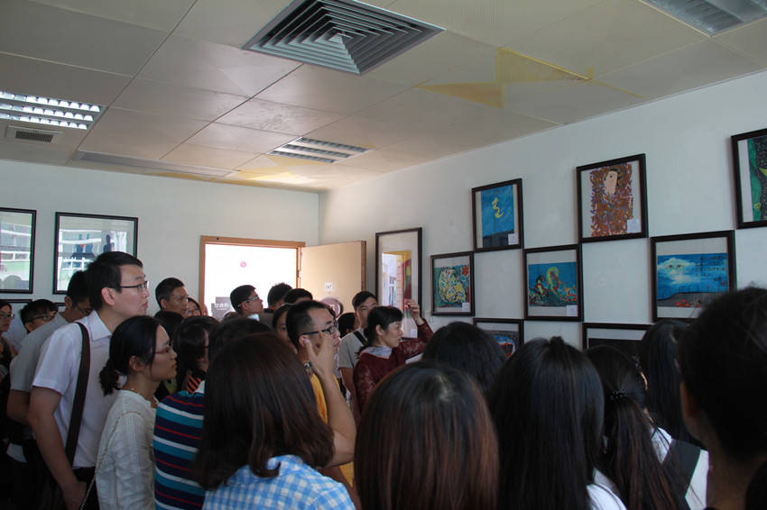 邱鸿钟教授带领出席领导和嘉宾参观了原生艺术与心理漫画作品,并作出详细介绍。各参展作品吸引了参观人员的兴趣,纷纷拍照留念并对作品内容进行探讨。据悉,上百幅来自省内精神病医院精神障碍患者的画作以及大学生原创心理漫画将在经管楼5楼进行为期两个月的展示。