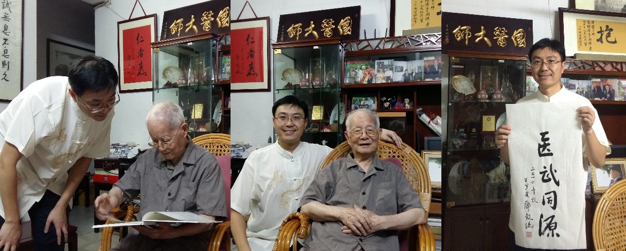 邓老指出,21世纪是中医学的世纪,目前中医学的基础理论与技术实践已经越来越走向世界,被国际学术界所逐步理解、接受,我们要对中医学有信心,要继承并发扬好中医学。传统武术,特别是内家拳、健身气功等,均是中医学体系中行之有效的养生保健方法,是医武同源的高度体现,是中华文化的精髓。邓老嘱托张进博士,一定要在我校把传统武术继承下去并发扬光大。张进博士向邓老介绍了自己在美国访学期间参与塔夫茨大学补充与替代医学中心的太极拳临床研究,中心主任王岑岑教授主持的太极拳治疗Fibromyalgia临床研究成果发表在《新英格兰医学杂志》上,是目前补充与替代医学领域最高水平的标志性文章。邓老听闻后分外高兴并亲自手书“医武同源”墨宝赠予张进博士作为勉励。