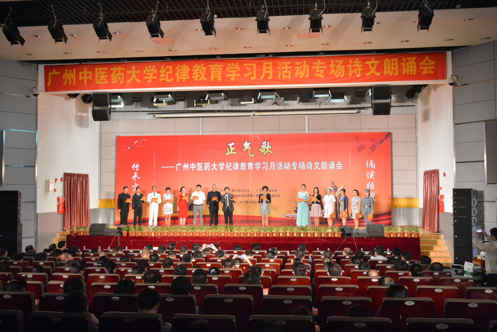当纪律教育遇上诗文朗诵,是否可以诠释“严肃活泼”?10月29日下午,我校与广东省朗诵协会在大学城校区联合举办了一场名为《正气歌》的纪律教育学习月活动专场诗文朗诵会。“朗朗乾坤有正气,浩然长存天地间。一腔正气诵经典,两袖清风树清廉。”师生们认真聆听诗文朗诵,浩然正气在校园回荡。