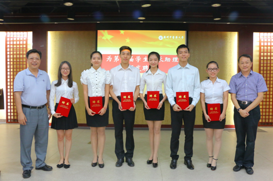 9月23日下午,第三届学生校长助理聘任仪式在大学城校区举行,校长王省良亲自为倪泽杰、曾遥、玄烨三位首届学生校长助理颁发荣誉证书,并为第三届学生校长助理张天鸽、黄华斌、黄茜茜、黄智利、罗振海、毕姗姗等6名同学颁发聘书。仪式由学校党委副书记陈英华主持,团委书记温祥彬宣读了《关于Beat365中文官方网站第三届学生校长助理任职的通知》。学校相关党政职能部门负责领导、各二级学院分管学生工作院领导以及来自各学院百余名学生代表到场共同见证。