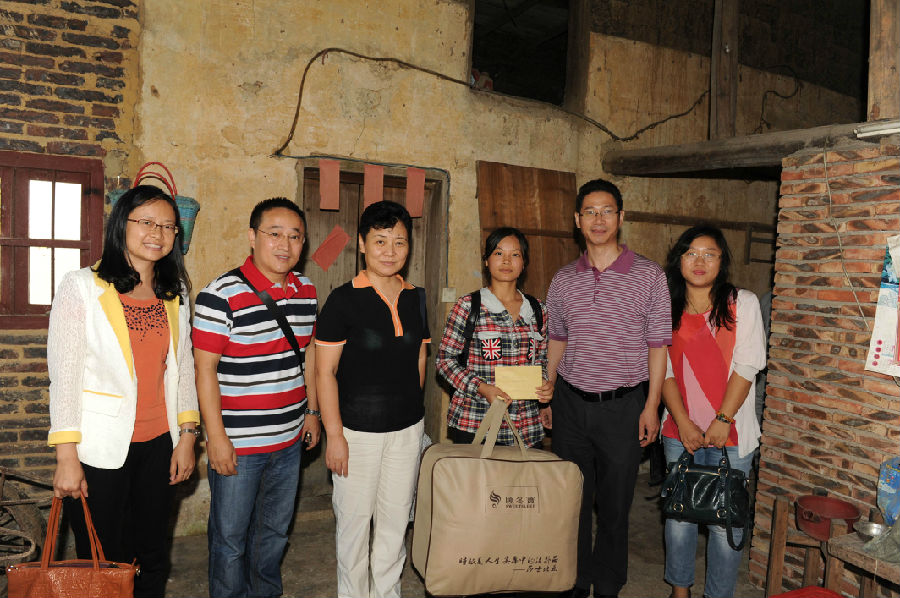 在大崀村孤儿邓彩华家里,张建华充满爱心的探望了她,为女孩送上御寒的棉被等物资,耐心细致的询问她学习、生活现状,鼓励女孩要勇于面对困难,在社会、村镇和我校的爱心热心支持下积极面对生活。