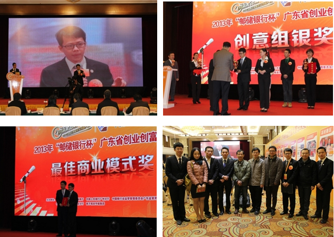 "邮储银行杯"2013年广东省创业创富大赛总决赛于12月20日在广东迎宾馆召开。本次大赛由广东省人力资源和社会保障厅、中国人民银行广州分行、中国银行业监督管理委员会广东监管局、中国邮政储蓄银行广东省分行、南方报业传媒集团联合主办。 经过层层选拔,付铨盛同学所带领的"景天创业团队"从1.6万个报名项目中脱颖而出,在决赛中以高校赛区第一名的成绩获得2013年广东省"邮储银行杯"创业创富大赛创意组银奖和大赛唯一的"最佳商业模式奖"。景天创业团队由高明、符崖两位老师指导。此前,该团队曾在"助你创业、赢在广州"第二届大学生创业大赛中获得一等奖。