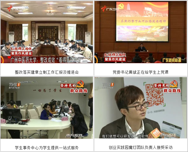12月20日,广东卫视、南方电视台、南方日报、羊城晚报集中报道了我校党的群众路线教育实践活动成效,组建"学生事务中心"、成立学生创业学院(创业实践园),附属医院外地患者优先挂专家号、"精益管理"等实实在在的举措在校内外引起较大反响。