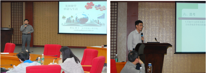 "归国留学人员论坛旨在为我校出国(境)进修教师搭建一个学术、信息交流平台,更好地发挥留学人员反哺学校的作用",在主持人李坤寅处长简短致辞后,因参加学术会议而从美国德州大学达拉斯分校短期回国的曹东博士以"美国留学申请与生活"为主题,从美国初印象、留美申请、美国生活三个方面介绍了留学美国的切身经历,认为学术、语言水平以及相当程度的经济支持是成功获得留美访问学者的三大条件,并与在座观众分享了美国"菜"比"肉"贵、车比人多以及"Made in China(中国制造)"随处可见等饶有兴味的生活点滴。随后,从香港大学李嘉诚医学院访学归来的富文俊博士则主要介绍了香港大学教学、科研管理特色,以及香港的中医药氛围,并建议出国(境)留学者理智选择是否留学、何时留学,慎重选择学科、研究方向,留学期间应不卑不亢地争取应得的地位与经费。同时他也对教师访学归来的后续培养问题积极建言献策。演讲完毕后,在座的老师就自己感兴趣的问题与两位主讲人进行了友好热烈的互动交流。