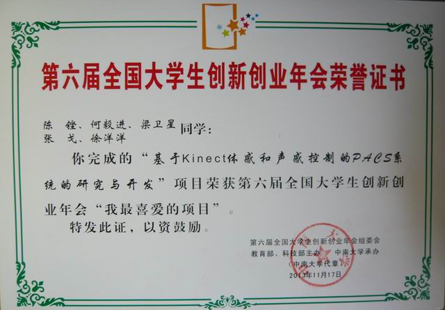 11月16日-17日,由教育部、科技部联合主办的第六届全国大学生创新创业年会在中南大学隆重举行,来自全国160余所高校的师生代表参加了此次年会,我校医学信息工程学院学生陈铿、何毅进、梁卫星、张戈、徐洋洋完成的项目(指导老师:陈平平、赵文光、谭定英)"基于Kinect体感和声感控制的PACS系统的研究与开发"入选此次年会展示项目,并荣获第六届全国大学生创新创业年会"我最喜爱的项目"。