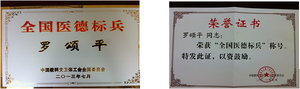 近日,罗颂平教授被中国教科文卫体工会授予"全国医德标兵"称号。