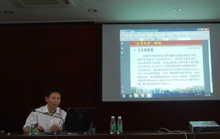 在这场题为"糖尿病并发症及治疗药物研究新进展"的讲座中,王教授详实地介绍了自己的最新研究成果,以及糖尿病并发症发病的新机制和治疗的新进展。王教授以严谨、谦逊的学者风范赢得了在座听众的热烈掌声。100分钟的讲课结束后,原定20分钟的提问交流环节持续了40多分钟,包括第一临床医学院、基础医学院、中药学院几位教授在内的10多名师生向王教授提问,内容涉及国外科研管理机制、出国留学应具备的基本知识和技能等,都得到了王教授深入透彻的解答。