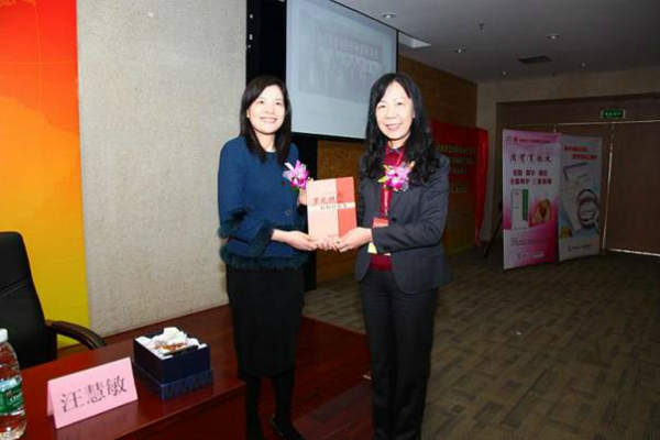 香港中医学会汪慧敏会长赠送纪念品,罗颂平教授回赠书籍
