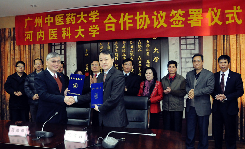 2013年1月9日,越南河内医科大学阮德馨校长一行5人到访我校,签署合作协议。双方约定开展中医药临床、科研、教学方面的交流与合作,以互派专家、学者进修与访问,合办学术及医疗研讨会等方式,加强中越中医药的交流与合作,共同促进中医药事业在越南的发展。 王省良校长、许能贵副校长及相关部门负责人出席了签约仪式并与越南客人举行了座谈,王省良校长代表学校与越方签署了合作协议。 越南河内医科大学是越南历史最悠久的医科大学,在2007年被评为越南15所全国重点大学之一。