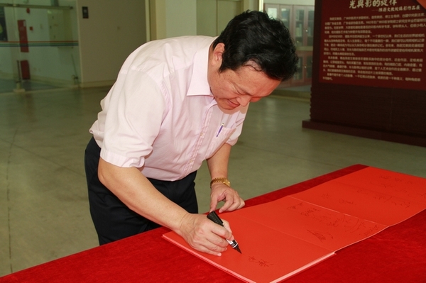在三楼艺海堂,黄斌书记兴致勃勃地参观了陈蔚文教授摄影作品展,对这些作品的艺术性和思想性做了高度评价。观展结束后,黄斌书记为图书馆题辞:"读书是人生最大的乐趣",表达了他对学生读者和图书馆的殷切期望。