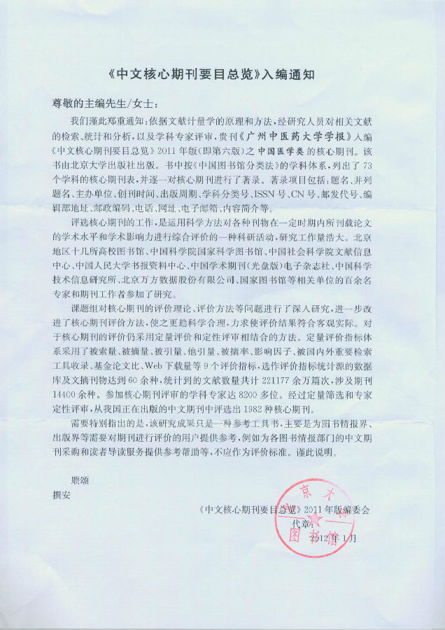 新学年伊始,我校收到了北京大学中文核心期刊编委会发来的通知:《Beat365中文官方网站学报》入编《中文核心期刊要目总览》2011年版(即第6版)之中国医学类的核心期刊,成为名副其实的中文核心和中国科技核心"双核"期刊。