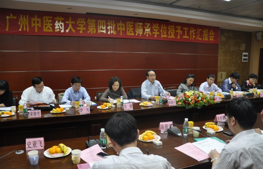王省良校长首先代表学校欢迎专家组对我校学位申请工作的指导,介绍了我校第四批中医师承攻读学位工作情况。专家组在听取研究生院关于我校第四批中医师承结业考核及学位授予的工作报告后,就其中的问题进行了提问;最后专家组对广东省中医药局与我校在中医师承工作中形成的"高度重视、共识一致、互相配合、成效显著"的局面给予赞赏,并对我省第四批师承的培养模式、管理机制、规范考核等方面的工作给予了充分肯定和高度评价。专家组一致认为,我校在第四批中医师承工作中的课程设置合理、培养计划科学、日常管理严格、规范条例完善,尤其"双导师制"的实行、经典课程与临床科研思维方法课程的师承课程建设,为其他培养单位提供了很好的借鉴,探索了一条中医临床医师攻读学位的新路子。