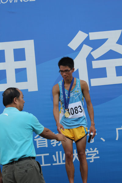 9月7日上午,我校运动员张南荣在广东工业大学举行的男子甲组10000米长跑决赛中勇夺冠军。 10000米,意味着运动员要绕田径场跑道跑25圈,是运动量相当大的一项田径赛事,关注10000米赛事的观众也明显增多,大家都在为跑道上坚持奋力奔跑的运动员大声呐喊鼓励,气氛紧张热烈。 张南荣同学在第10圈开始就一直保持良好状态领先,在最后一圈他尽力冲刺,最终以超过第二名200米的优势取得第一,成绩38分45秒43,为我校在省大运会的表现画上完美的一笔。