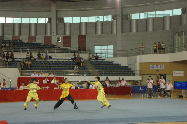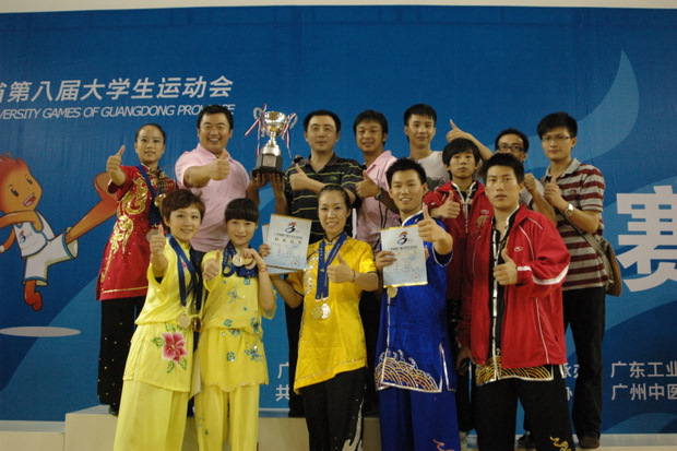 广东省第八届大学生运动会武术比赛于9月1日—3日在我校体育馆举行,我校武术队作为东道主最终以4金7银6铜总分151分的成绩获得团体第一名。 本次大动会武术比赛共设16枚金牌,面对4年一届的大运盛会,各校均派出了强大阵容参加角逐。经过3天激烈的竞争,金牌被我校和广州体育学院等6所高校收入囊中。我校派出8名运动员参加本次比赛,武术健儿们在赛场上奋勇拼搏,最终获此殊荣。 据悉,自2003年获得第一枚省大运会金牌以来,我校武术队共获得历届省大运会金牌9枚。2007年首次获得全国大学生运动会武术比赛金牌。今年首次获得省大运会武术比赛团体总分第一名,实现了历史性的突破。