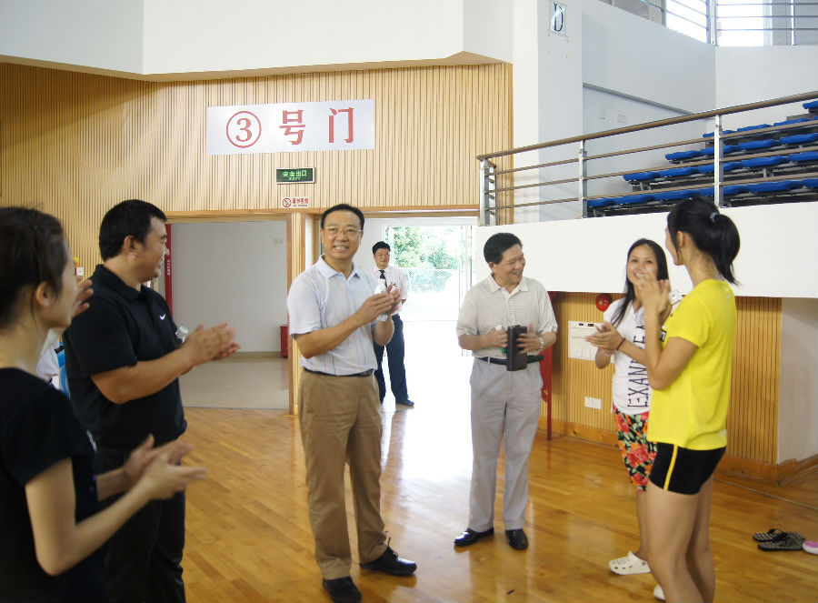 离第八届广东省大学生运会比赛还有4天,我校运动健儿进入最后的备战阶段。8月18日上午,徐志伟校长、林培政副校长来到大学城体育馆,亲切看望慰问运动员教练员,勉励大家咬定目标,轻装上阵,争取在赛场上拼出最好的精神状态和竞技水平,努力获得精神文明和竞赛成绩双丰收。