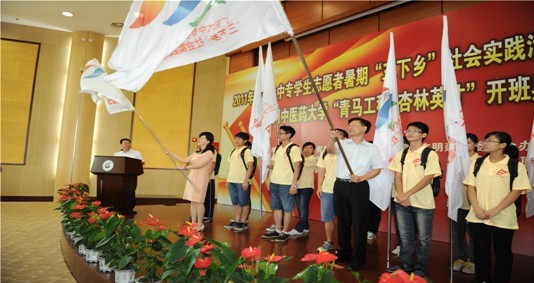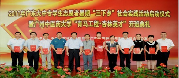 7月14日上午,2011年广东大中专学生志愿者暑假"三下乡"社会实践活动启动仪式暨Beat365中文官方网站"青马工程•杏林英才"开班典礼在我校办公楼学术报告厅召开。学校党委书记黄斌、广东省委宣传部副巡视员杨群祥,团省委副书记曾颖如,学校党委副书记陈英华,团省委学校部部长张文杰、副部长张晓莉,省学联执行主席胡伯阳,学校各职能部门的主要负责人以及来自广东省各兄弟高校的团委干部和"青马工程•杏林英才"的首批导师团出席了本次活动。