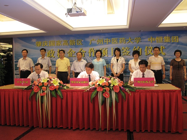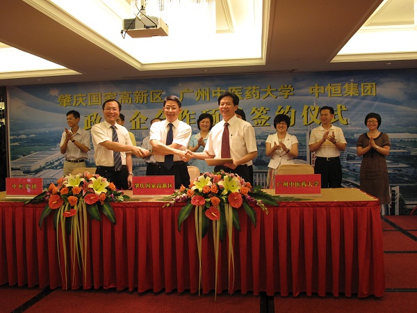 签约仪式上,我校党委副书记孙晓生、肇庆高新区管委会副主任江泽全、中恒集团副总裁陈明分别代表三方在合作协议上签字。据悉,今后三方将以该合作平台为依托,发挥自身优势并形成合力,共同推进中医药科技成果的培育和转化,做大做强广东中医药产业。