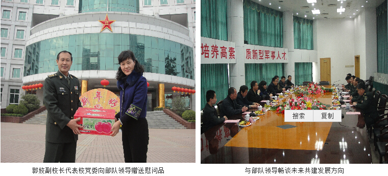 1月27日下午,郭副校长又带领党办、武装部、教务处等部门负责人到广州军事体育进修学院慰问部队官兵并赠送慰问品,受到了军体院孙副司令等领导的热情欢迎。郭副校长对军体院多年来为我校学生军训和军事理论教学工作所给予的大力支持和帮助表示衷心感谢,并表示要进一步加强与军体院多方面的合作共建,学习部队优良的作风和严谨的纪律,促进学校事业进步。