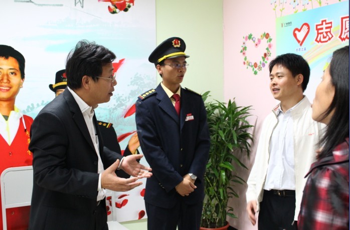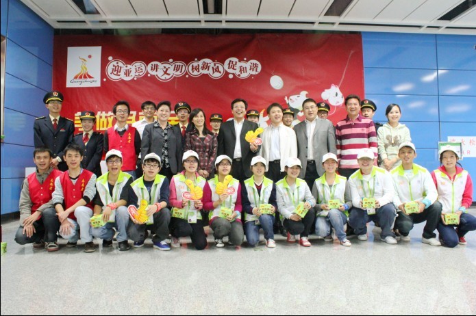 陈书记一行受到了地铁昌岗站,受到了地铁公司党委、团委和地铁公司员工的热烈欢迎。在简短的欢迎仪式上,陈书记对我校的地铁志愿者的工作表示了充分的肯定,对所有志愿者表示亲切的慰问和崇高的敬意,更勉励全体志愿者积极弘扬志愿服务、奉献互助的精神,服务亚运、服务来自世界各地的宾客朋友们。随后,还给每位志愿者发放了慰问品。