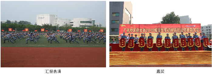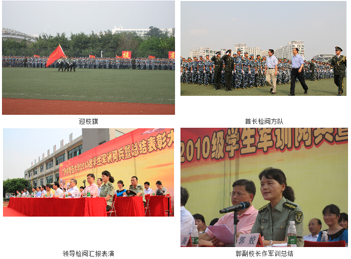 2010年9月29日下午,我校2010级学生军训阅兵暨总结表彰大会在大学城校区生活区体育场隆重举行。省军区军训办方裕平主任、省教育厅体卫艺处侯波同志、白云区武装部冷常春政委、中国人民解放军军事体育进修学院牛贵君大队长,军训团欧洪江团长、军训团王海柳政委,学校党委黄斌书记、徐志伟校长、孙晓生副书记、陈英华副书记、王宁生副校长、王新华副校长、刘晟副校长、郭姣副校长、学校军训领导小组成员、有关职能部门、二级学院负责人,兄弟院校武装部领导等出席大会。