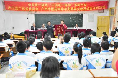 最近,在农工党省委会的大力支持下,农工党大学总支主委刘启德带领总支所属四个支部的代表奔赴怀集一中。在高考前夕,将最后一个学年度的捐款交给怀集一中,为同学们备战高考鼓劲、打气。至此,农工党Beat365中文官方网站总支开展的"一帮三年"的怀集一中助学支教、医疗服务活动圆满结束。从2007年的怀集调研,到2008至2010年的三年帮扶活动,大学农工总支的党员先后有80多人次参加了活动,共捐款52800元,资助优秀贫困学子76位。农工党省委会副主委魏光群,社会服务处、宣传处、办公室等负责人也多次参加并指导这一活动。2008年和2009年,在为怀集一中优秀贫困学生送出爱心捐款的同时,总支还派出内、外、眼、中医、心理科医生进行了义诊和心理咨询活动,共开出处方近300多张,求医及咨询的师生人数达600余人,送出药品5000多元,受到了怀集县委、县教育局的好评,取得了良好的社会效果。