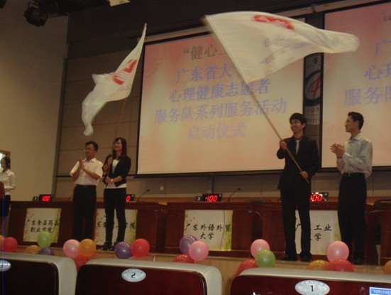 活动首先进行了"健心工程"广东省大学生心理健康志愿者服务队系列服务活动启动仪式,由团省委和省学联为刚成立的六支"健心工程" 广东省大学生心理健康志愿者服务队授旗。这六支服务队重要依托我校有关学生社团成立,将在今年下半年专门针对农民工子女、盲人、孤寡老人、大学生、普通市民等人群开展一系列以心理健康帮扶为主要内容的青年志愿者活动。