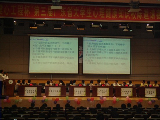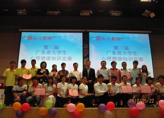 2010年5月22日,"健心工程"广东省大学生心理健康志愿者服务队系列服务活动启动仪式暨"健心工程杯"第三届广东省大学生心理健康知识校际邀请赛总决赛在我校隆重举行。团省委学校部科长邓倩文,省学联执行主席杨右森以及来自全省十多所高校的心理健康专家、心理健康学生社团代表参加了活动。
