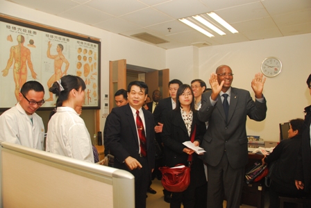 萨欣古武副总统年轻时行医,从事眼科、产科工作,早已仰慕简、便、廉、验的中医药,这次访华特意提出要亲身感受中医药的神奇魅力。当天,萨欣古武副总统一行兴致勃勃地参观了医院门诊中药房、综合科、针灸门诊、煎药室、产科和新生儿科。步入宽敞、明亮的新门诊楼大厅,萨欣古武副总统情不自禁地赞叹道:"你们医院真大、很漂亮,真希望我们国家也能拥有如此大规模的医院!"萨欣古武副总统每到一处都认真聆听,虚心交流,对第一附属医院的传统中医治疗方法颇感兴趣。在新生儿科,他还熟练地换上一次性消毒衣帽,慈爱地抱起一位小女婴,笑称要带回布隆迪以增进中布两国的友好情谊。