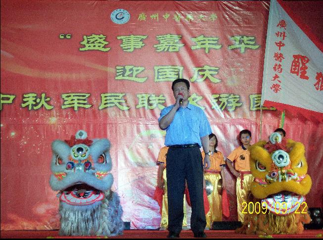 游园晚会分文艺表演和游戏两个部分。文艺节目开始前,学校党委黄斌书记致辞,他对09级新生与教官的军训成果给予了充分的肯定并对全校师生致以诚挚的节日问候。徐志伟校长和军训部队团长一起为醒狮点睛。晚会过程中,12个学生自编自演的节目精彩纷呈,掌声不断。