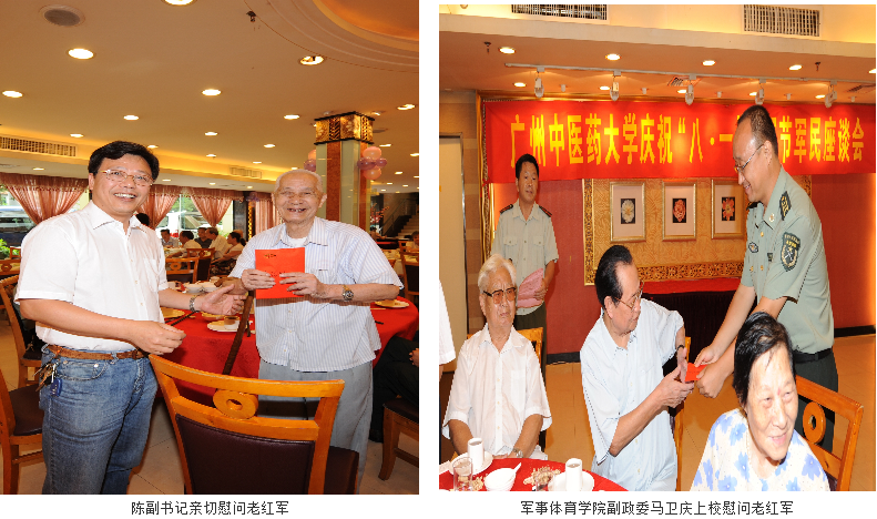 7月29日下午,我校在三元里校区隆重举行纪念中国人民解放军建军八十二周年军民座谈会。学校党委陈英华副书记,党办邝卫红主任,宣传部简福爱部长,武装部梁沛华部长、赵元忠副部长,中国人民解放军军事体育进修学院副政委马卫庆上校、黄辉参谋,广东省军区学生军训办主任方裕平少校、戴红宾参谋,以及我校老红军,抗日战争、解放战争时期的老同志,烈军属,伤残军人,复员、转业、退伍军人等共130多人参加本次座谈会。座谈会由学校武装部赵元忠副部长主持。
