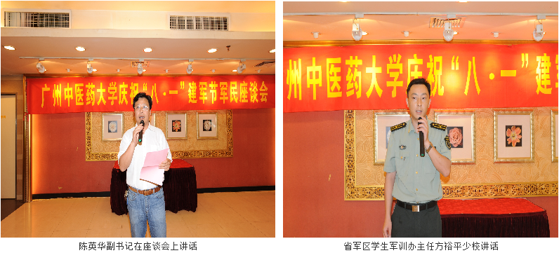 陈英华副书记首先发表讲话。近年来,我校武装工作取得了显著成绩,我们将继续开展拥军优抚活动,深化同中国人民解放军军事体育进修学院军民共建内涵,并做好学校优抚工作。陈副书记代表学校党委感谢我校老红军,抗日战争、解放战争时期的老同志,复员、转业、退伍的同志们及有特殊贡献的烈军属、伤残军人,为祖国、为我校建设和发展做出的贡献,并向为我校军训工作提供高素质教官和教员的中国人民解放军军事体育进修学院,和为我校军训提供武器装备保障的省军区军训办和白云区武装部表示感谢!