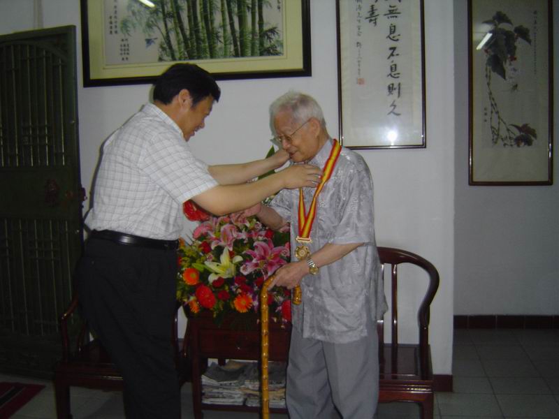 彭炜局长也对邓老入选首届"国医大师"表示祝贺,同时祝贺邓老入选国家级非物质文化遗产项目(中医诊法)代表性传承人,感谢邓老多年来对中医事业的贡献,嘱咐邓老保重身体。吴刚、彭炜一起为邓老授予国家级非物质文化遗产项目(中医诊法)代表性传承人勋章、奖座。
