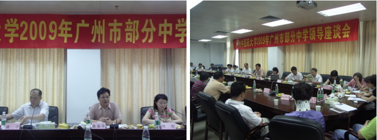 为了加强与中学的沟通联系,宣传介绍我校的办学情况,以推动招生工作的顺利开展,历年来我校都会在高考前期邀请部分广州市重点中学校领导来校座谈交流。5月27日上午,2009年的中学校领导座谈会首次在大学城校区办公楼十一楼会议室举行。校党委陈英华副书记、学生处林彬处长、侯宁副处长以及包括省实验中学、执信中学、培正中学在内的二十多所广州市重点中学的领导代表出席了本次会议。