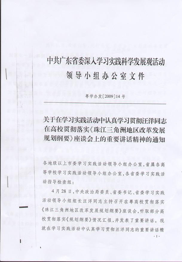 1、《关于在学习实践活动中认真学习贯彻汪洋同志在高校贯彻落实< 珠江三角洲地区改革发展规划纲要>座谈会上的重要讲话精神的通知》(粤学办发〔2009〕14号)