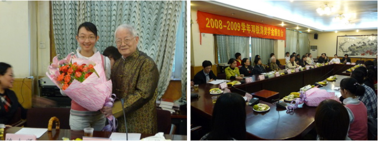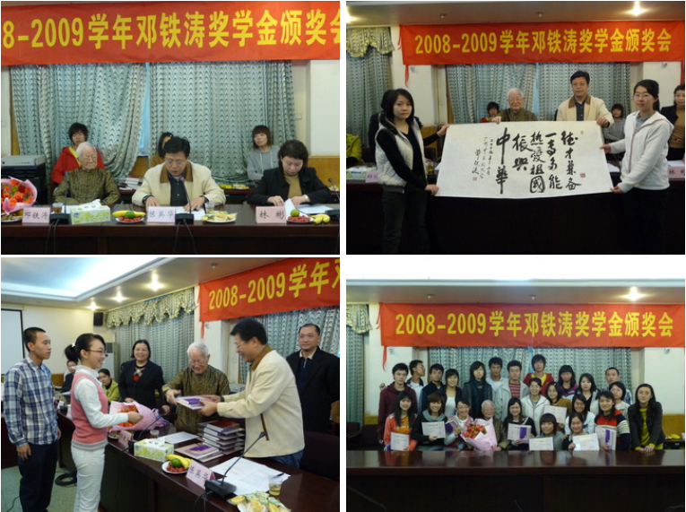 2009年3月31日下午,在学校三元里校区二楼会议室举行了2008-2009学年邓铁涛奖学金颁奖会。邓铁涛教授、陈英华副书记出席了会议,与会的人员还有学生处林彬处长、教务处邱仕君处长、学生处侯宁副处长、第一临床医学院郭文海副书记、第二临床医学院郑永臻处长、第三临床医学院江钢辉副书记、中药学院李明希副书记、经济与管理学院凌子平书记、针灸推拿学院官坤祥副书记、信息技术学院龚建文老师、护理学院方义洁书记、人文社科学院邓劲松书记、职业技术学院郭锡全副书记及获奖的25名学生。国医大师、全国名老中医、973首席科学家、我校终生教授、邓铁涛奖学金的设立者邓铁涛教授亲自为获奖学生颁发了奖励证书及邓老的有关著作。