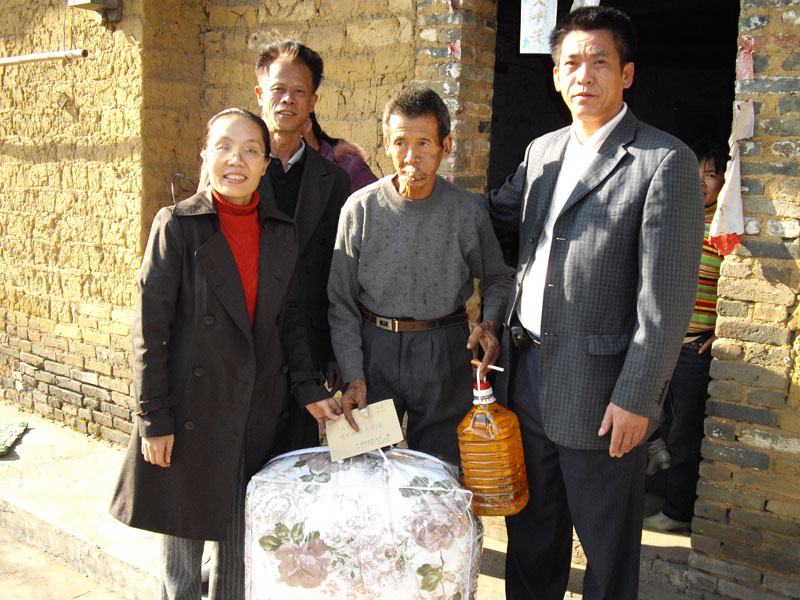 来到贫困党员梁叔华家,我们被他的乐观向上的精神感动了,他们夫妇二人均有残疾,失去了劳动能力,唯一的生活来原是外出打工的女儿,但他们仍然乐观地生活,积极向上,我们送上了棉被、食用油等慰问品和慰问金。在45年党龄的老党员邓海英家中,我们受到了热情的接待,虽然已经76岁了,但她的身体仍然很好,还在坚持下地干农活。她的唯一的女儿在十年前去世,现在只有老伴和她相依为命,虽然村里不时有点帮助,但生活仍然很艰难,当我们送上了慰问品和慰问金后,她也非常感动,一再道谢。最后我们还去慰问了贫困学生钱耀宝,他的祖父母和父亲都已去世,但生活的贫困没有影响到他勤奋学习积极向上的意志,贴满墙的奖状证明了他的努力。由于他正在学校上课,我们把书包、文具和助学金交给了他的母亲。