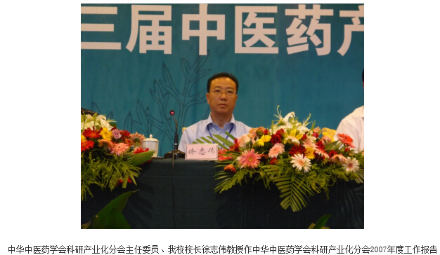 会议由中华中医药学会科研产业化分会副主任委员兼秘书长、我校副校长王新华教授主持,中华中医药学会科研产业化分会主任委员、我校校长徐志伟教授向全体与会代表作了2007年度工作报告。大会审议并通过了中华中医药学会科研产业化分会2007年度工作报告,讨论并确定了科研产业化分会下一步的工作计划和工作重点。中华中医药学会李俊德秘书长就分会的工作和中医药科研产业的发展作了重要的讲话,强调了产学研合作的重要性,指出我们要解放思想,以创新引领中医药科技产业发展,推进科技成果转化。国家中医药管理局吴刚副局长也作了重要指示,指出产学研结合工作将对中医药产业发展产生重大作用,应建立健全产学研合作的长效合作机制、规划及实施机制;探索完善产学研结合的投入体系;逐步完善有效的产学研激励机制。